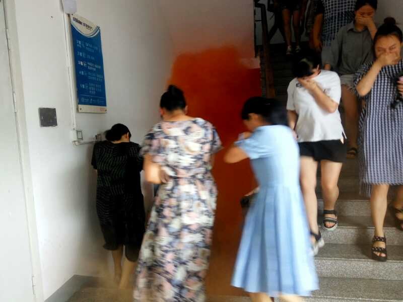 火灾警报铃声响起,全体人员通过消防楼梯按照指定的疏散线路,用毛巾捂住口鼻,有序地进行紧急疏散,并第一时间撤离到安全地带。