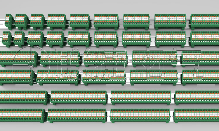 我们从客户成本控制角度出发,采用较新的弹簧式接线方式,并且推出2-40位一体式模具,避免了拼接带来的外观不规整、拼接时间长等困扰;同时考虑到接地功能,可以将接地的部分与普通导轨部分混合使用,较大程度上降低了拼接的时间。