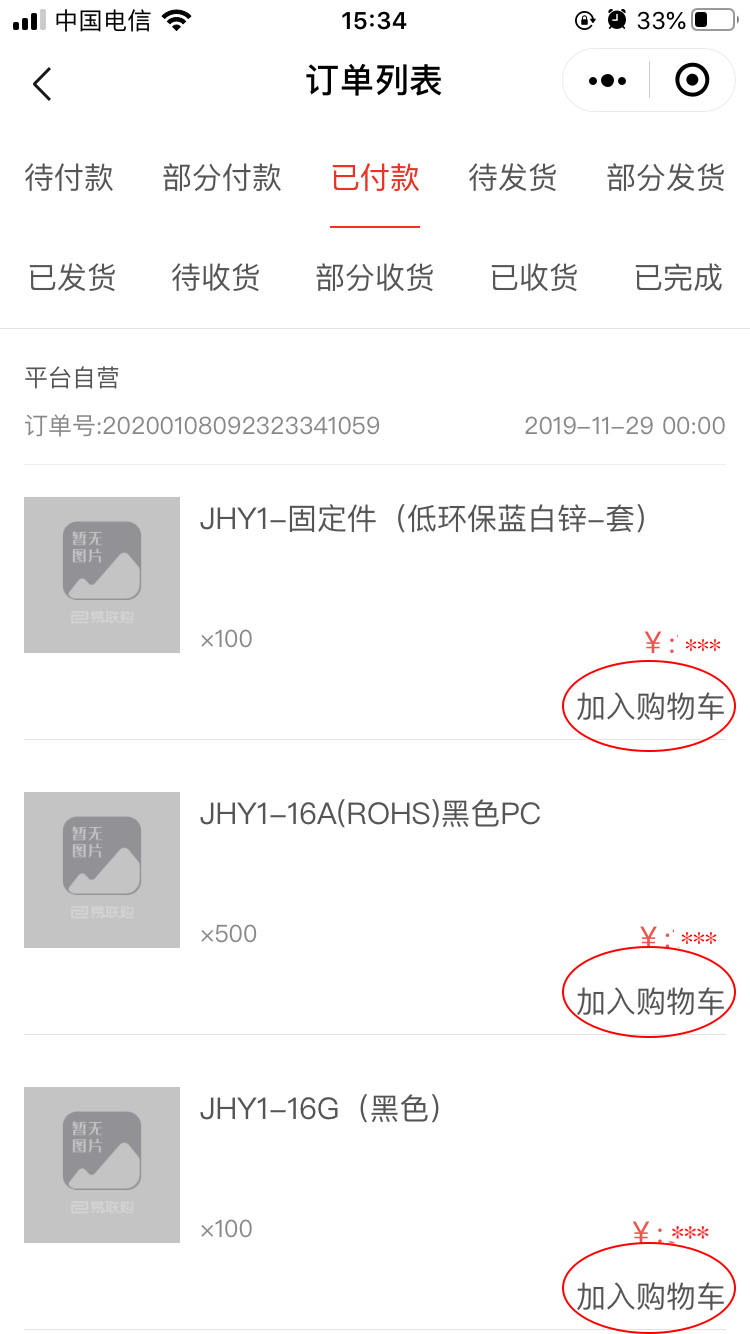 购买已经下过单的产品可从我—我的订单内任一选项(如已付款/已收货等)—选择曾经购买过的接线端子产品加入购物车—修改产品数量—添加收货地址—结算